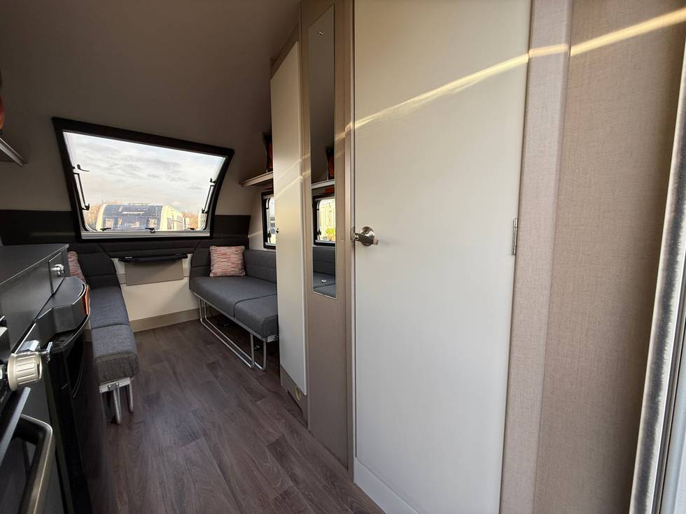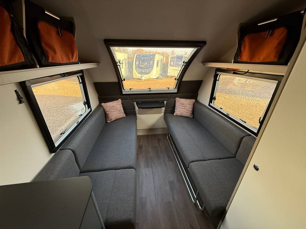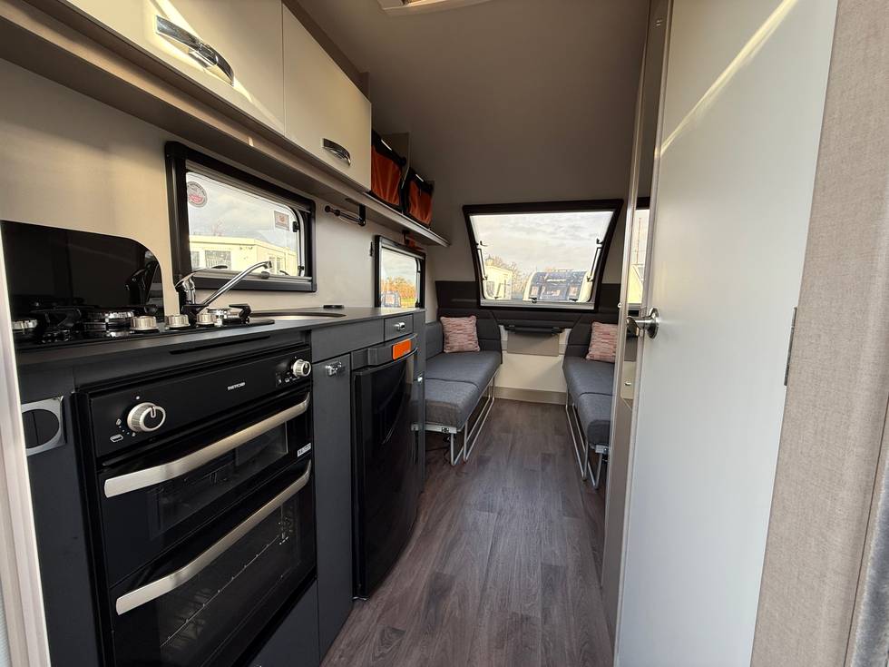 Front lounge bench seating / double bed conversion, Central storage area, Rear corner washroom to include toilet, hand washbasin and shower, Long kitchen across the opposite side and entrance door to the rear.