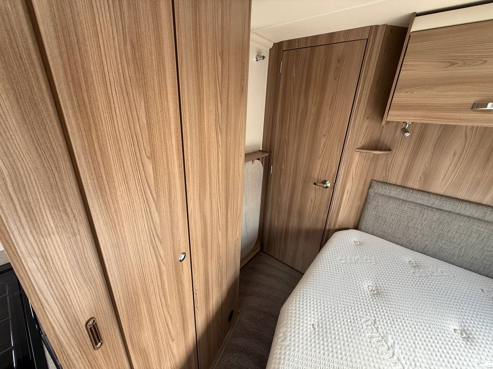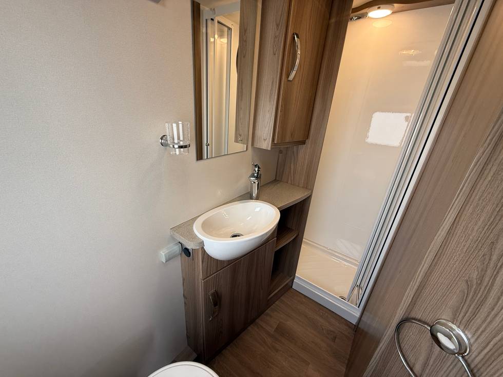 Front lounge seating with double bed, Central kitchen, Worktop/storage area opposite, Fixed double bed with wardrobe storage to the side, Full end washroom to include toilet, sink unit and separate shower cubicle.