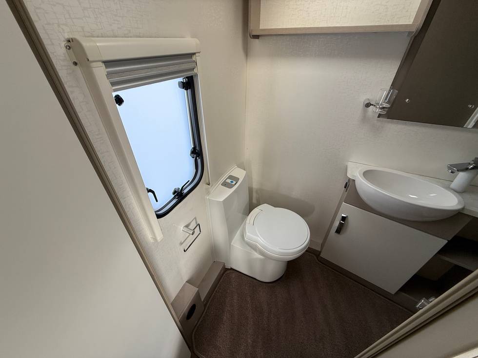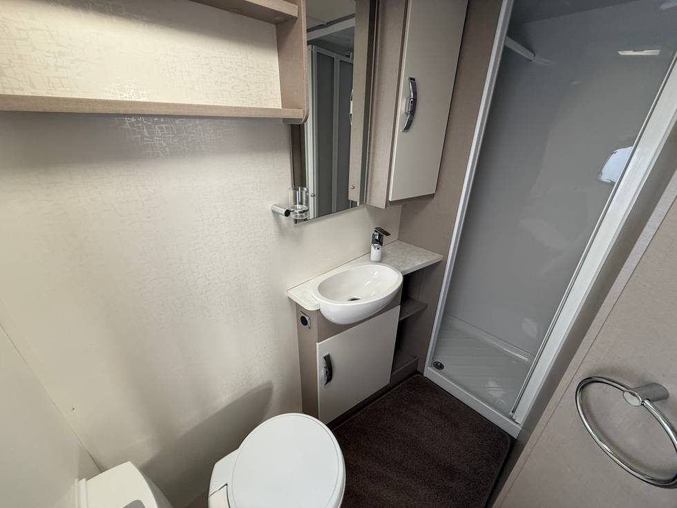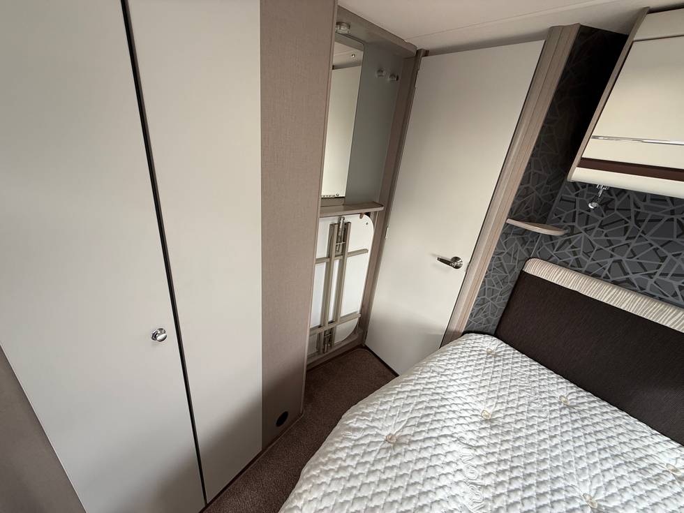 Front lounge seating with double bed, Central kitchen, Worktop/storage area opposite, Fixed double bed with wardrobe storage to the side, Full end washroom to include toilet, sink unit and separate shower cubicle.