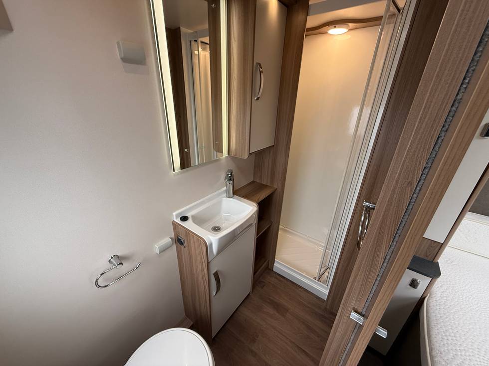 Front lounge seating with double bed, Central kitchen with storage/worksurface area opposite, Fixed transverse island bed with wardrobe storage either side, Full end washroom to include toilet, sink unit a separate shower cubicle...