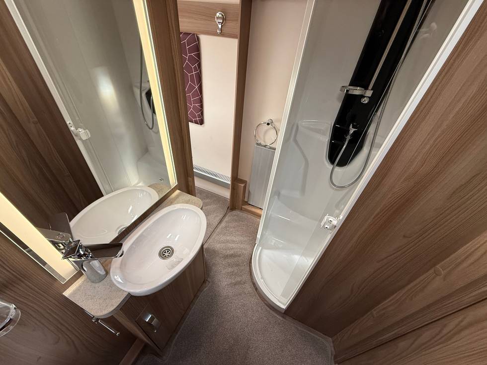 Front lounge seating with double bed, Central kitchen, Tall Fridge/Freezer opposite, Centre washroom to include toilet and wardrobe to one side, central sink unit and separate shower to the opposite side, End bedroom with fixed transverse island bed and wardrobe storage either side.