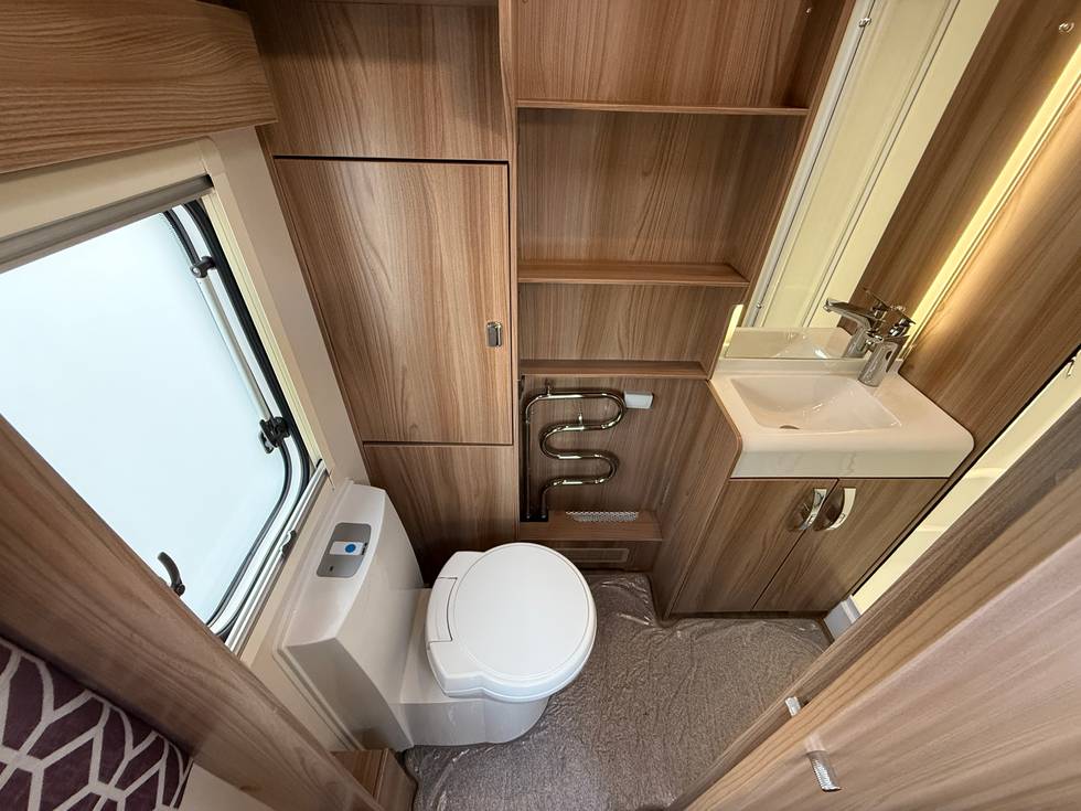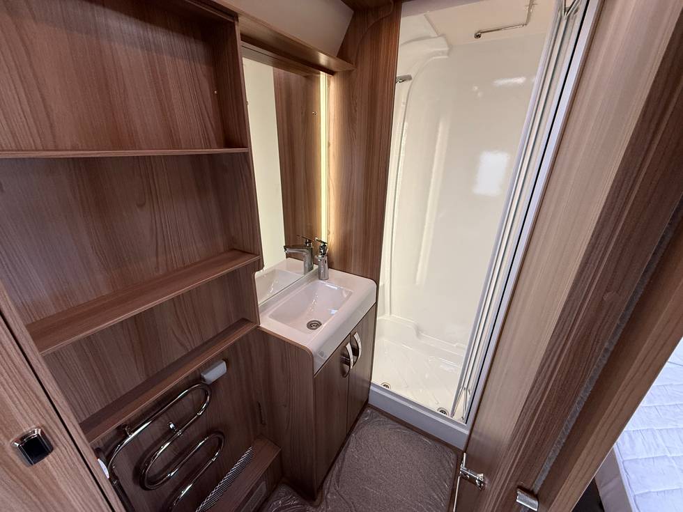 Front lounge seating with double bed, Central kitchen with tall fridge/freezer opposite, Fixed transverse island bed with wardrobe storage either side, Full end washroom to include toilet, sink unit and separate shower cubicle..