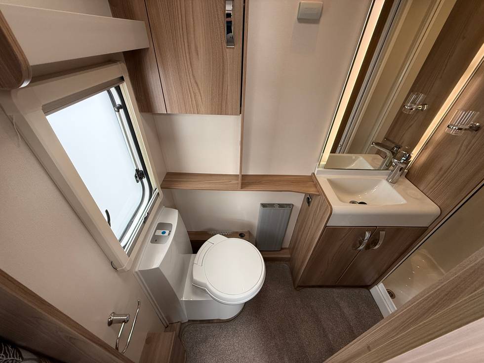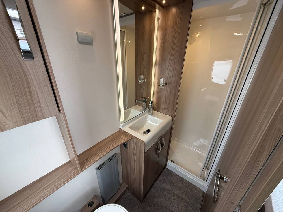 Front lounge seating with double bed, Central kitchen with storage/worktop opposite, Fixed transverse island bed with wardrobe storage either side, Full end washroom to include toilet, sink unit and separate shower cubicle..